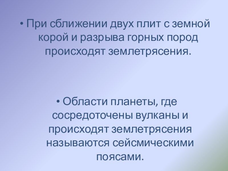 При сближении двух плит с земной корой и разрыва горных пород происходят землетрясения.