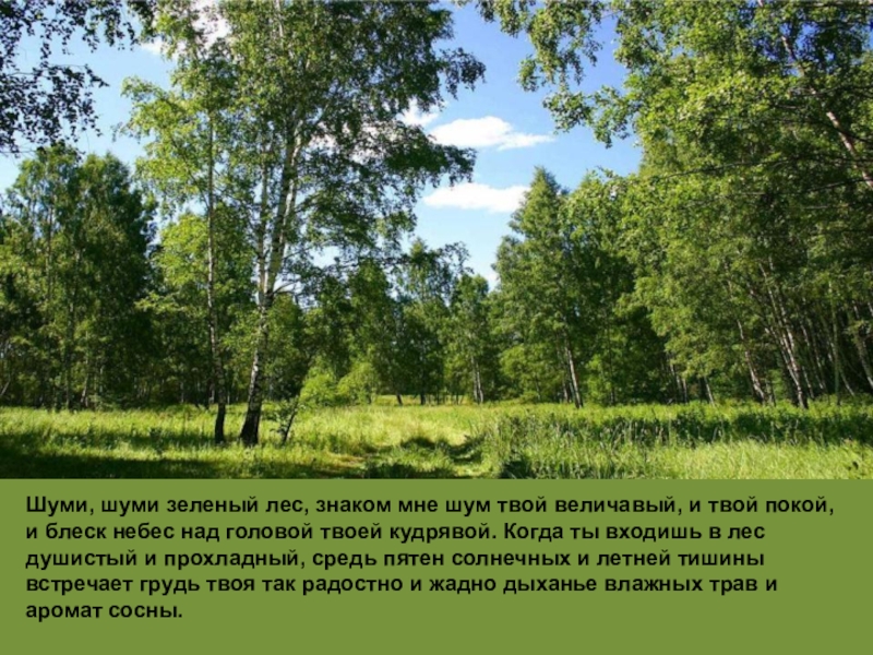 Шуми, шуми зеленый лес, знаком мне шум твой величавый, и твой покой, и блеск небес над головой твоей кудрявой. Когда ты входишь в лес душистый и прохладный, средь пятен солнечных и летней тишины встречает грудь твоя