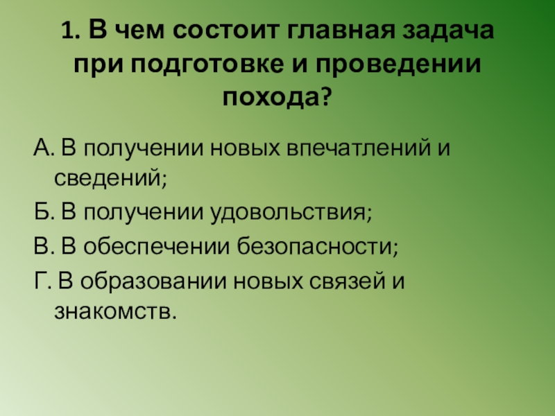 1. В чем состоит главная задача при подготовке и проведении похода?А. В получении новых впечатлений и сведений;Б.