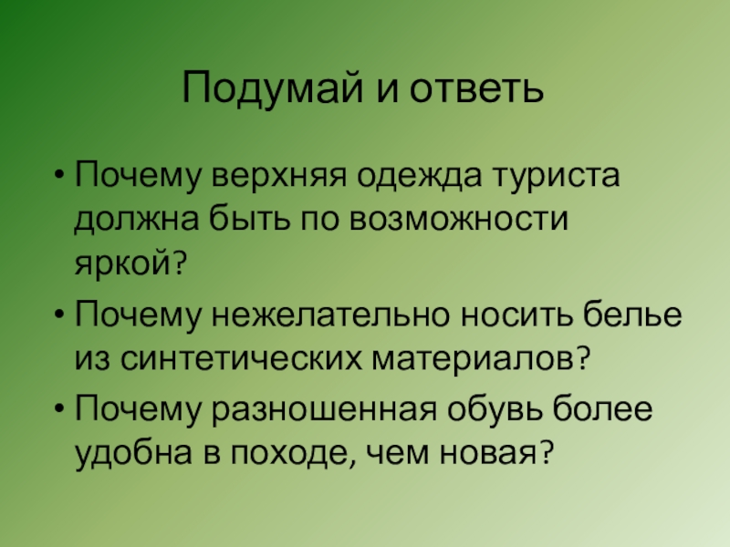 Подумай и ответьПочему верхняя одежда туриста должна быть по возможности яркой?Почему нежелательно носить белье из синтетических материалов?Почему