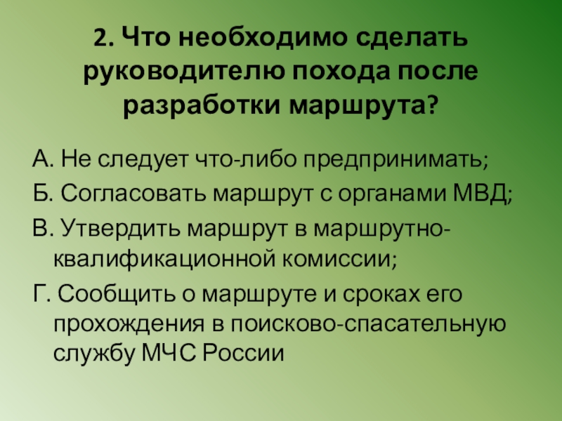 2. Что необходимо сделать руководителю похода после разработки маршрута?А. Не следует что-либо предпринимать;Б. Согласовать маршрут с органами