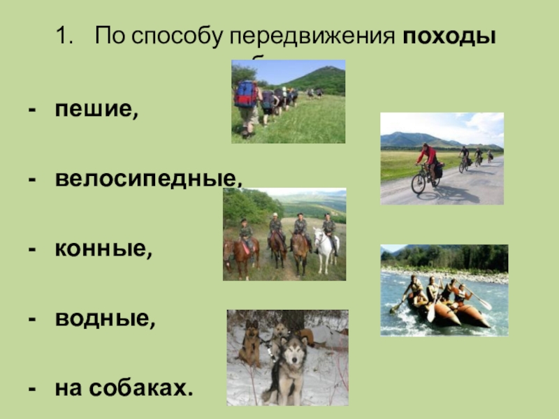 По способу передвижения походы бываютпешие,велосипедные,конные,водные,на собаках.