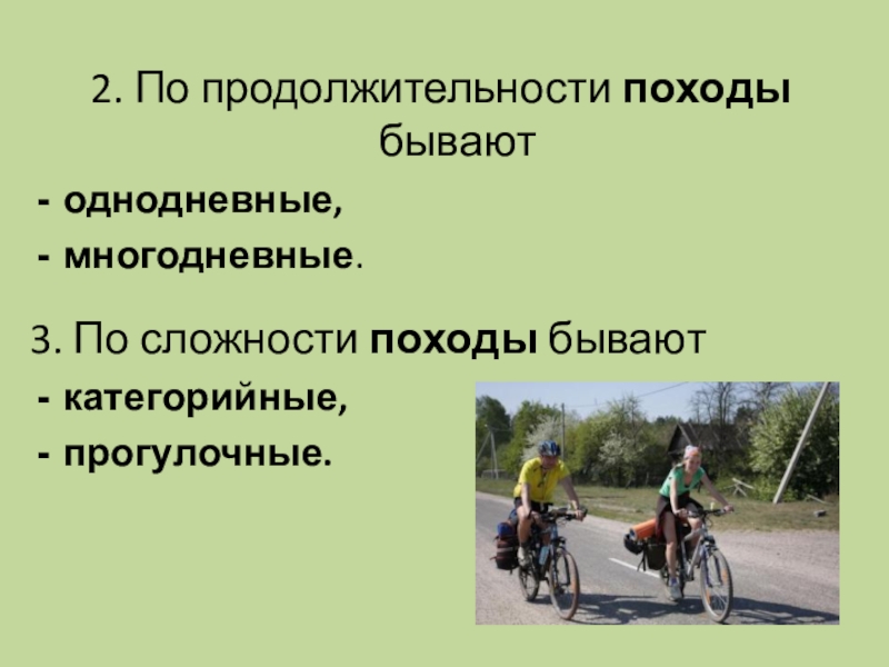 2. По продолжительности походы бываютоднодневные,многодневные.3. По сложности походы бываюткатегорийные,прогулочные.