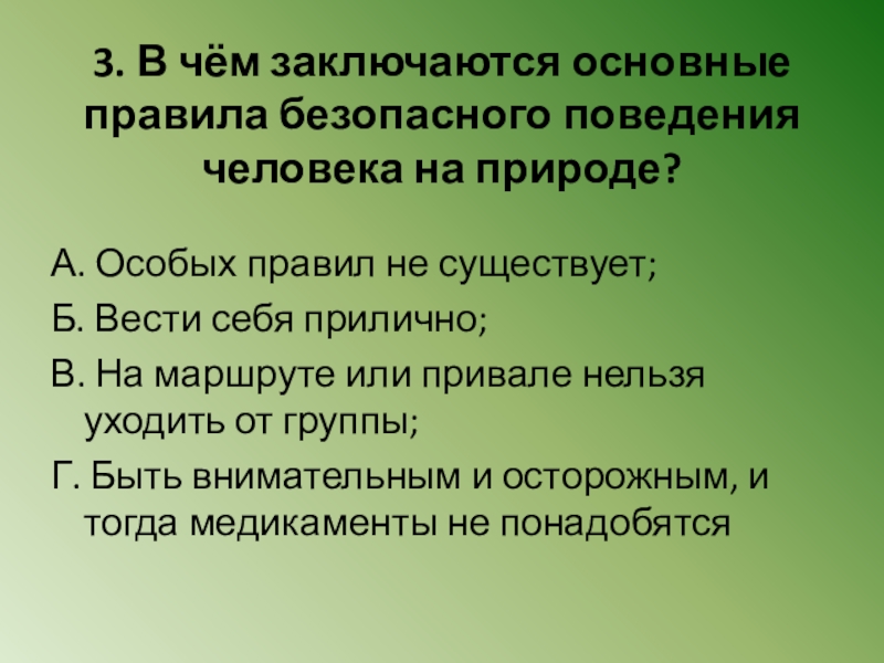 3. В чём заключаются основные правила безопасного поведения человека на природе?А. Особых правил не существует;Б. Вести себя