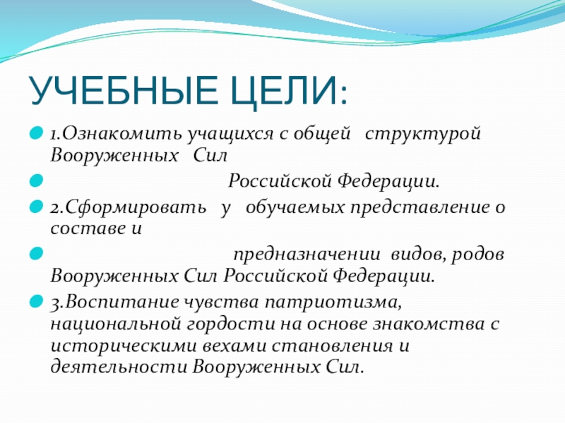 1.Ознакомить учащихся с общей структурой Вооруженных Сил