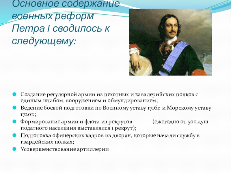 Слайд 4Основное содержание военных реформ Петра I сводилось к следующему: