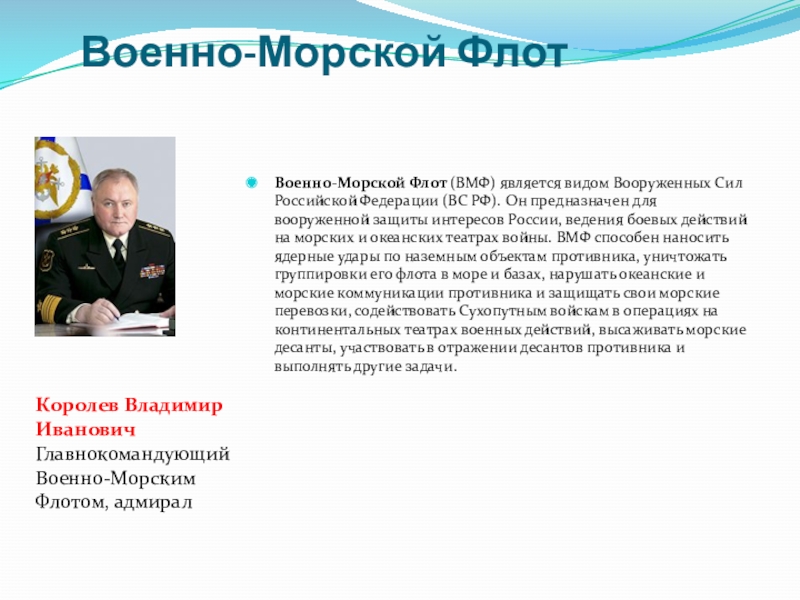 Военно-Морской Флот (ВМФ) является видом Вооруженных Сил Российской Федерации (ВС РФ).