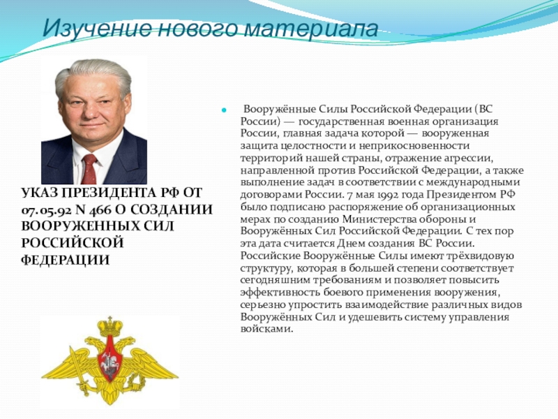УКАЗ ПРЕЗИДЕНТА РФ ОТ 07.05.92 N 466 О СОЗДАНИИ ВООРУЖЕННЫХ СИЛ РОССИЙСКОЙ ФЕДЕРАЦИИ