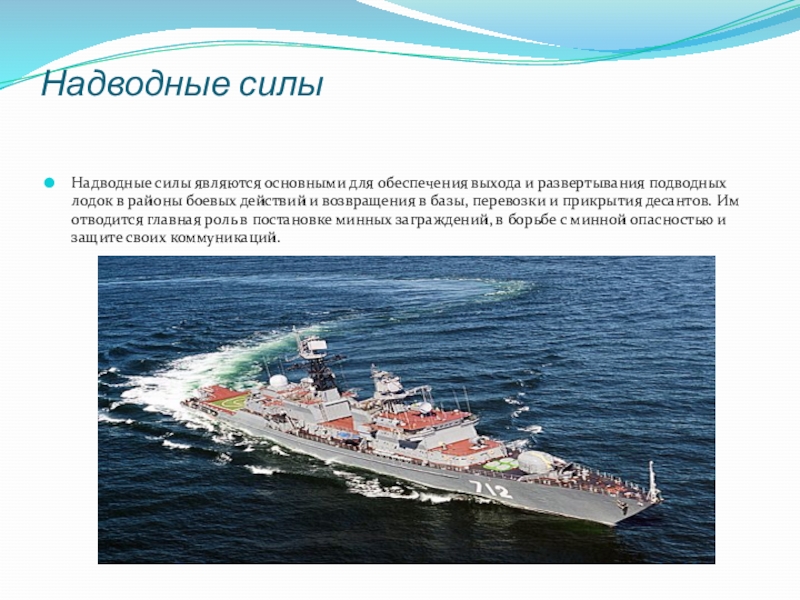Надводные силы являются основными для обеспечения выхода и развертывания подводных