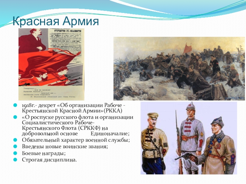 1918г.- декрет «Об организации Рабоче -Крестьянской Красной Армии»(РККА)