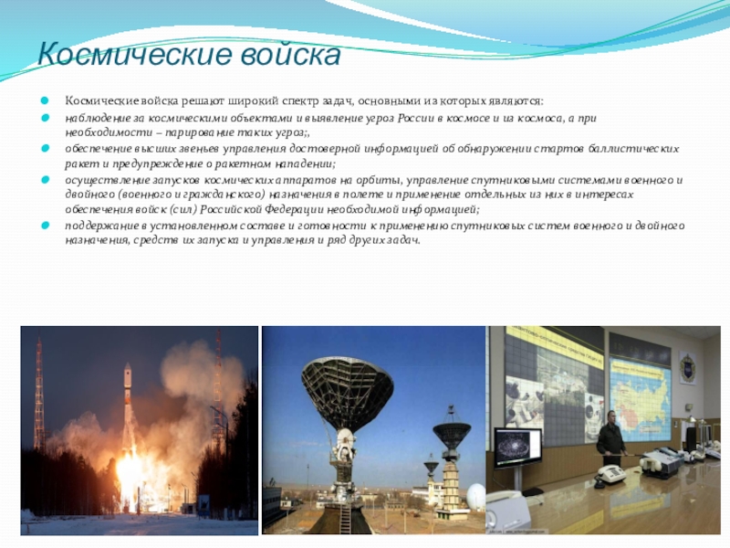 Космические войска решают широкий спектр задач, основными из которых являются: