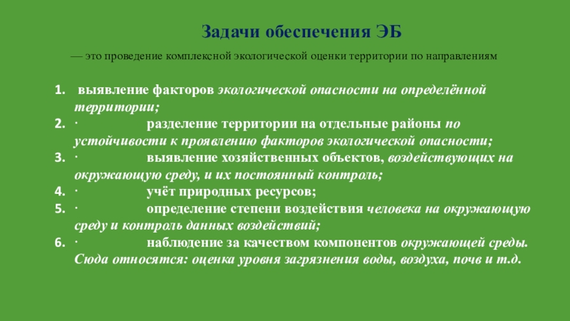 Объектом ЭБ может являться как компонент окружающей среды, так и интересы человека в плане обеспечения его права на благоприятную окружающую среду
