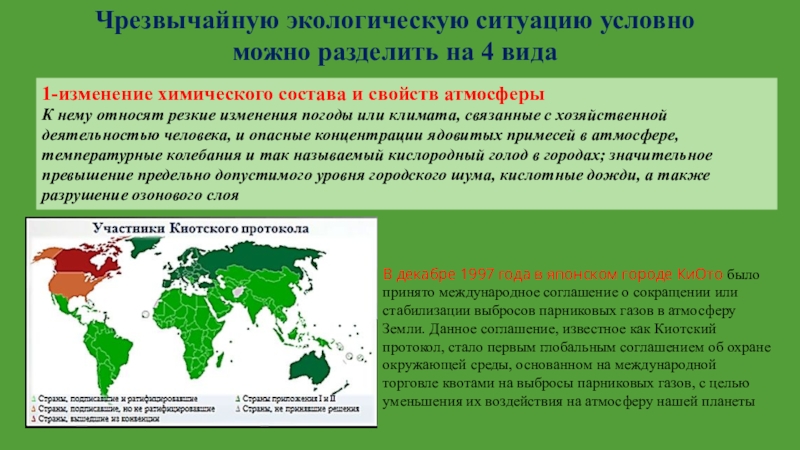 В декабре 1997 года в японском городе КиОто было принято международное соглашение о сокращении или стабилизации выбросов парниковых газов в атмосферу Земли. Данное соглашение, известное как Киотский протокол, стало первым глобальным соглашением об охране окружающей среды, основанном на международной торговле квотами на выбросы парниковых газов, с целью уменьшения их воздействия на атмосферу нашей планеты
