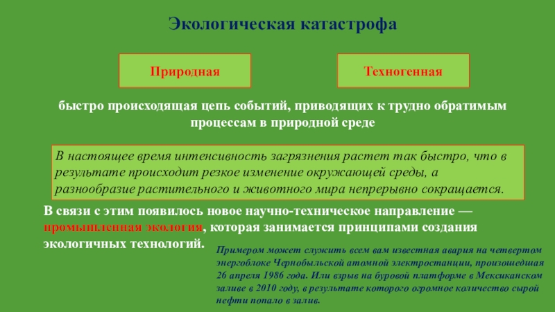Примером может служить всем вам известная авария на четвертом энергоблоке Чернобыльской атомной электростанции, произошедшая 26 апреля 1986 года. Или взрыв на буровой платформе в Мексиканском заливе в 2010 году, в результате которого огромное количество сырой нефти попало в залив.