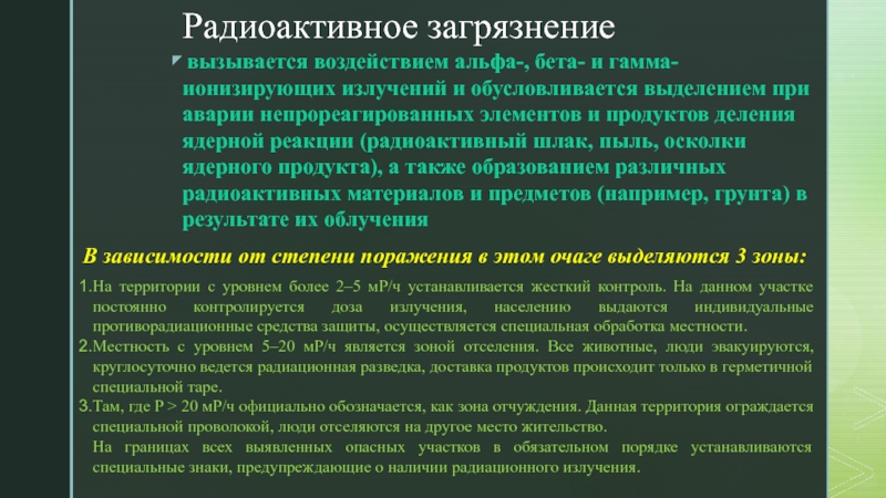 Там, где Р > 20 мР/ч официально обозначается, как зона отчуждения. Данная территория ограждается специальной проволокой, люди отселяются на другое место жительство.