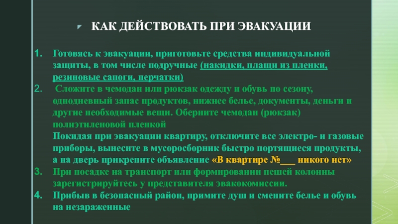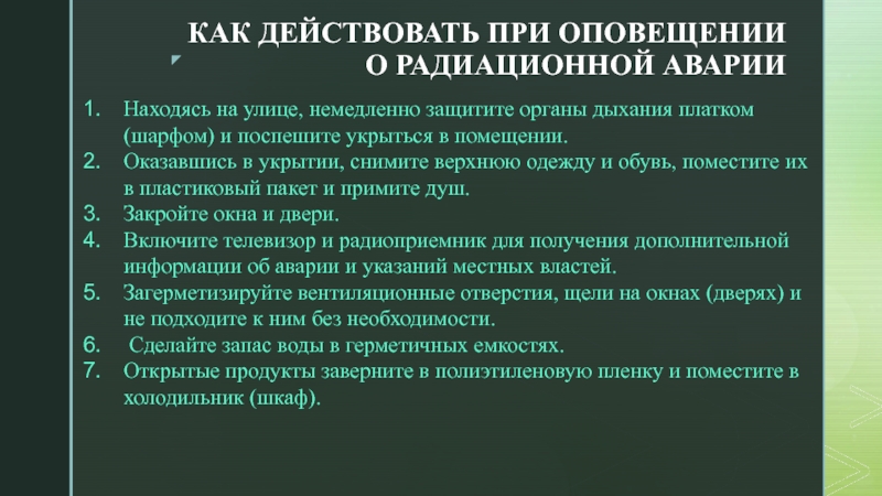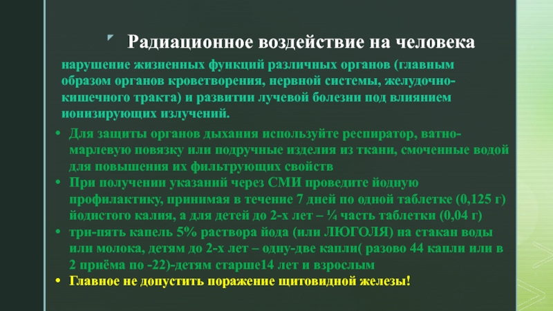 При получении указаний через СМИ проведите йодную профилактику, принимая в течение 7 дней по одной таблетке (0,125 г) йодистого калия, а для детей до 2-х лет – ¼ часть таблетки (0,04 г)