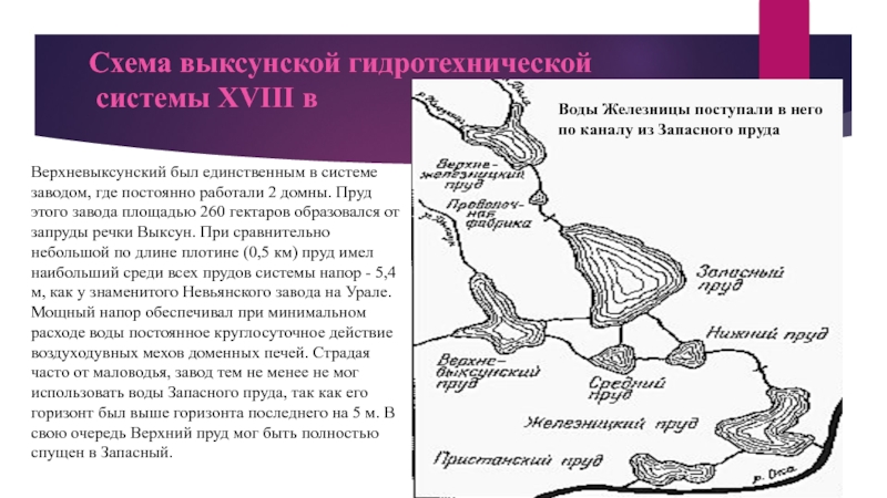 Верхневыксунский был единственным в системе заводом, где постоянно работали 2 домны. Пруд этого завода площадью 260 гектаров образовался от запруды речки Выксун. При сравнительно небольшой по длине плотине (0,5 км) пруд имел наибольший среди всех прудов системы напор - 5,4 м, как у знаменитого Невьянского завода на Урале. Мощный напор обеспечивал при минимальном расходе воды постоянное круглосуточное действие воздуходувных мехов доменных печей. Страдая часто от маловодья, завод тем не менее не мог использовать воды Запасного пруда, так как его горизонт был выше горизонта последнего на 5 м. В свою очередь Верхний пруд мог быть полностью спущен в Запасный.