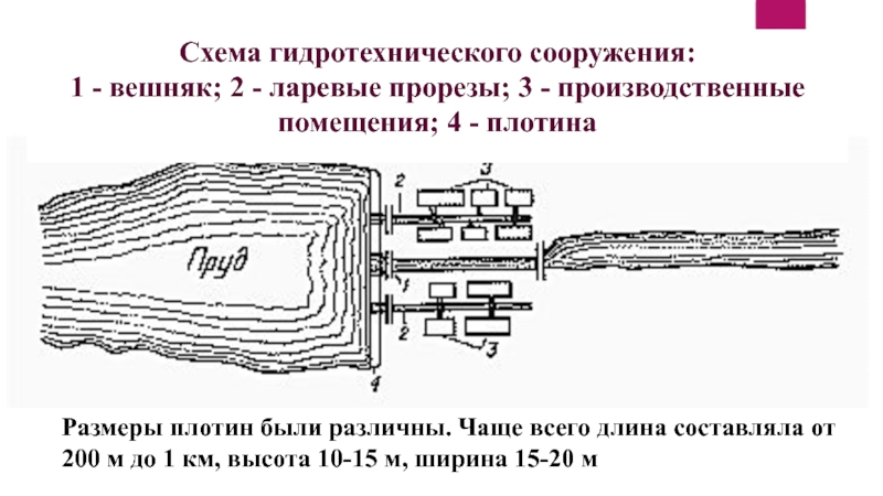 Размеры плотин были различны. Чаще всего длина составляла от 200 м до 1 км, высота 10-15 м, ширина 15-20 м