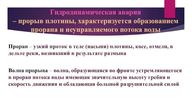 Волна прорыва – волна, образующаяся во фронте устремляющегося в проран потока воды имеющая значительную высоту гребня и скорость движения и обладающая большой разрушительной силой