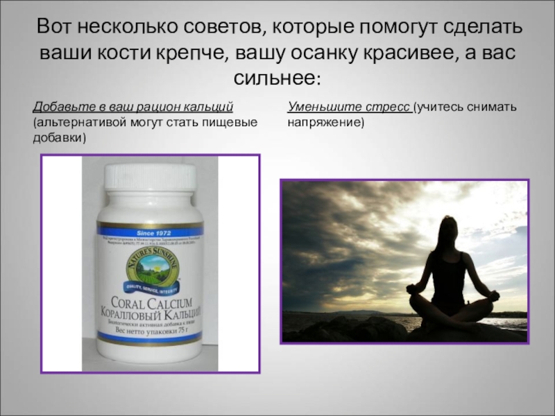 Слайд 16Вот несколько советов, которые помогут сделать ваши кости крепче, вашу осанку