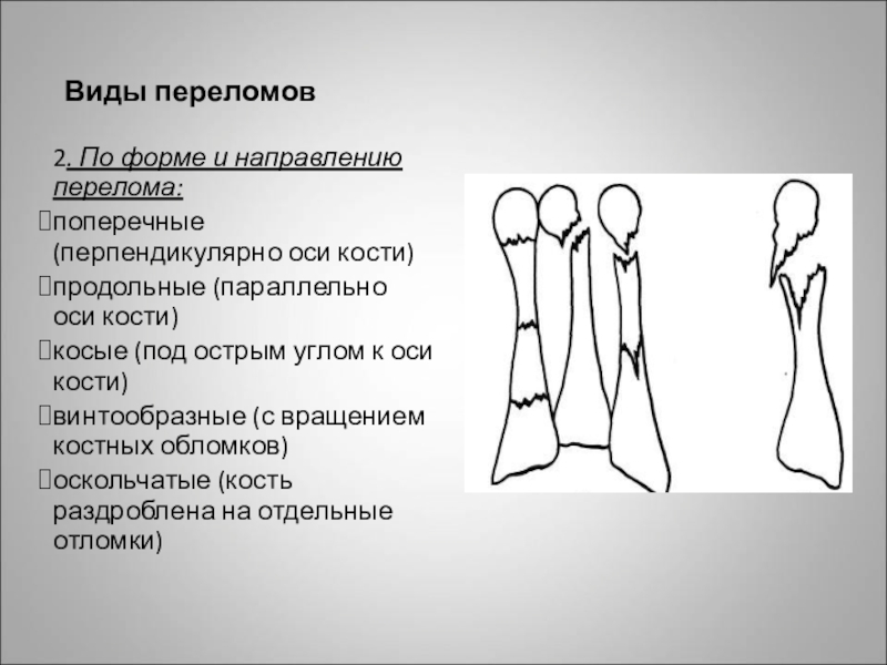Виды переломов2. По форме и направлению перелома:поперечные (перпендикулярно оси кости)продольные (параллельно оси кости)косые (под острым углом к