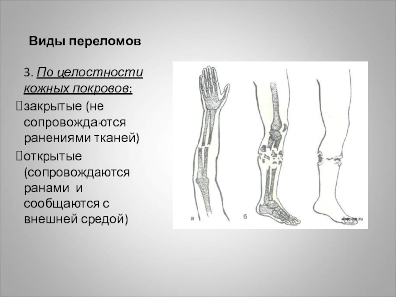 Виды переломов3. По целостности кожных покровов:закрытые (не сопровождаются ранениями тканей)открытые (сопровождаются ранами и сообщаются с внешней средой)