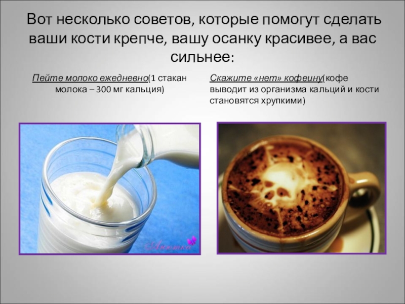 Скажите «нет» кофеину(кофе выводит из организма кальций и кости становятся хрупкими)