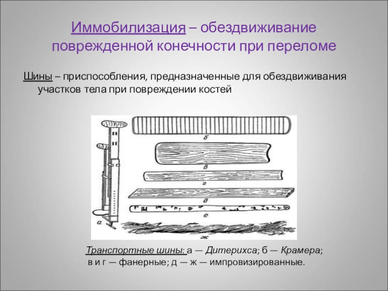 Иммобилизация – обездвиживание поврежденной конечности при переломеШины – приспособления, предназначенные для обездвиживания участков тела при повреждении костейТранспортные