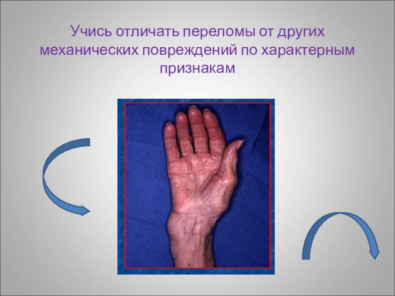 Слайд 7Учись отличать переломы от других механических повреждений по характерным признакам