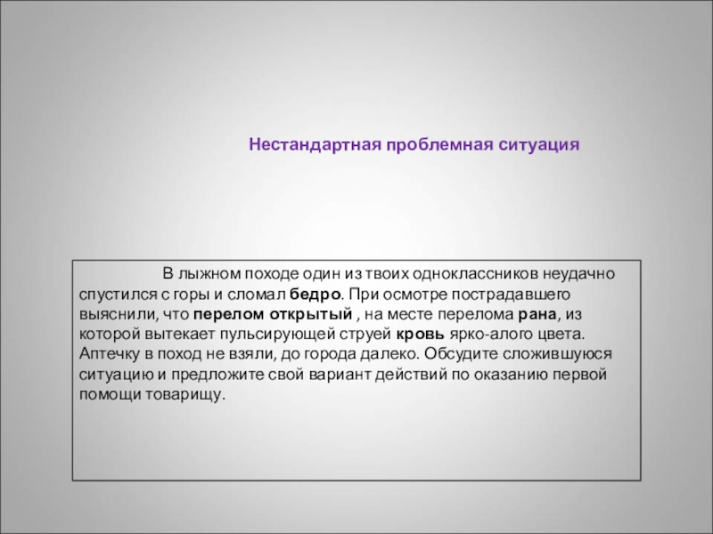 В лыжном походе один из твоих одноклассников неудачно спустился с горы и сломал бедро. При осмотре пострадавшего выяснили, что перелом открытый , на месте перелома рана, из которой вытекает пульсирующей струей кровь ярко-алого цвета. Аптечку в поход не взяли, до города далеко. Обсудите сложившуюся ситуацию и предложите свой вариант действий по оказанию первой помощи товарищу.