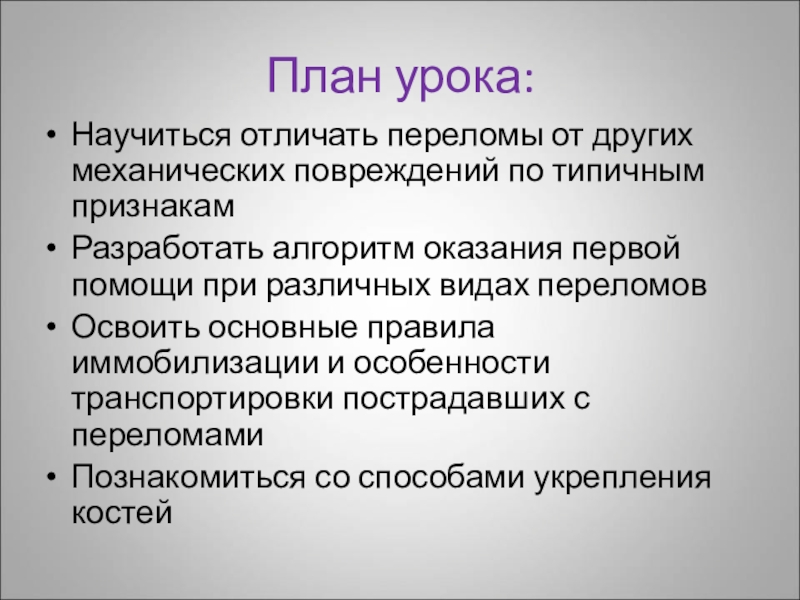 План урока:Научиться отличать переломы от других механических повреждений по типичным признакамРазработать алгоритм оказания первой помощи при различных видах переломовОсвоить основные правила иммобилизации и особенности транспортировки пострадавших с переломамиПознакомиться со способами укрепления костей