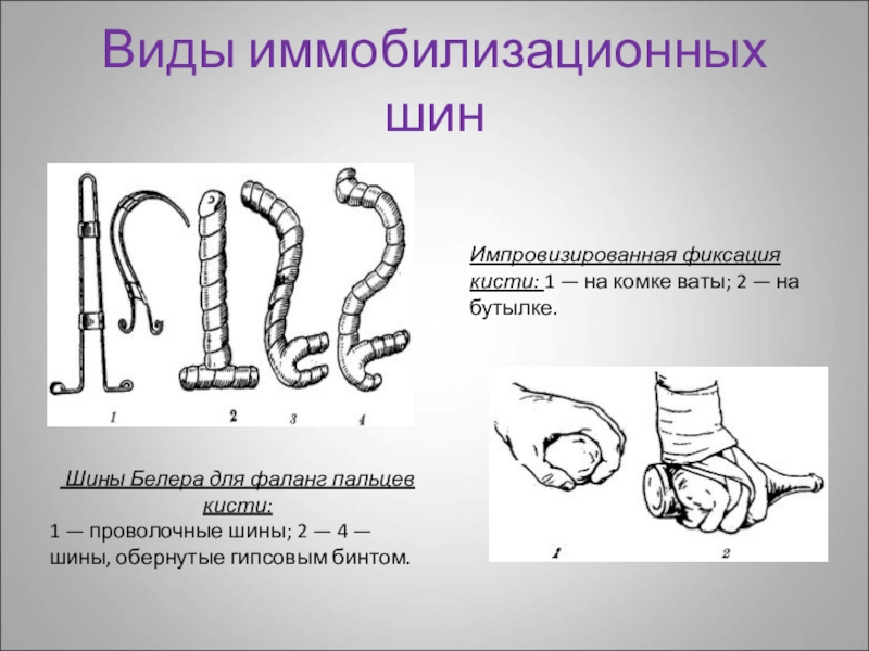 Виды иммобилизационных шин Шины Белера для фаланг пальцев кисти: 1 — проволочные шины; 2 — 4 —