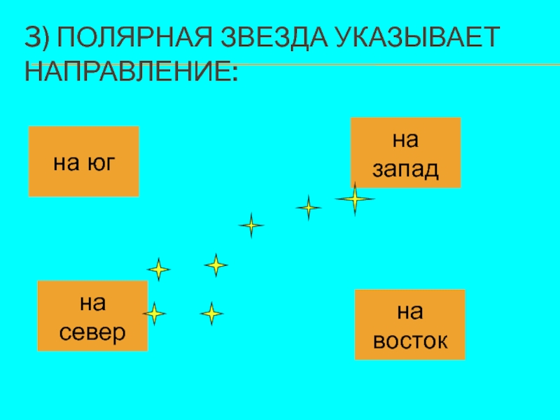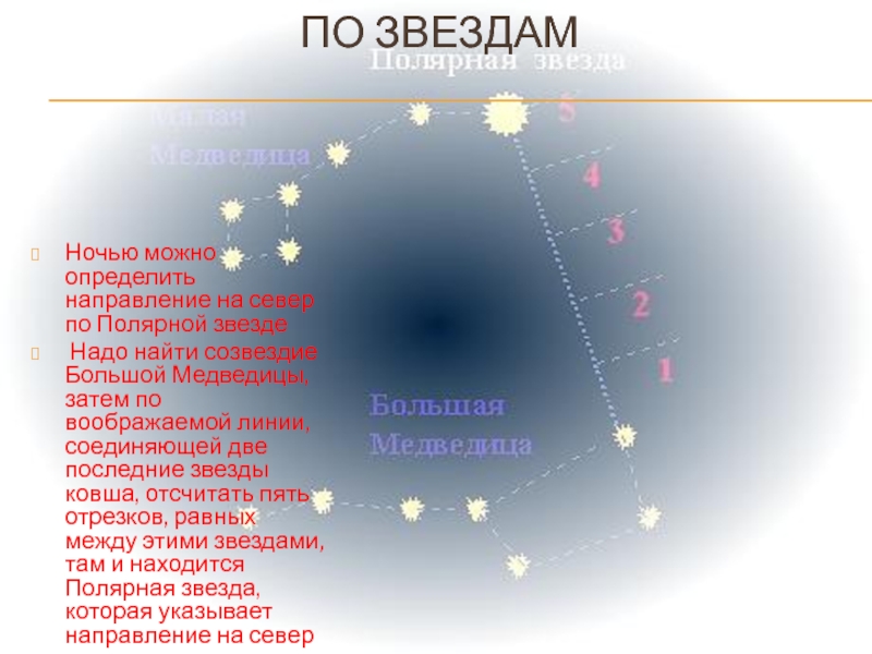 Надо найти созвездие Большой Медведицы, затем по воображаемой линии, соединяющей две последние звезды ковша, отсчитать пять отрезков, равных между этими звездами, там и находится Полярная звезда, которая указывает направление на север
