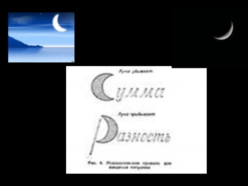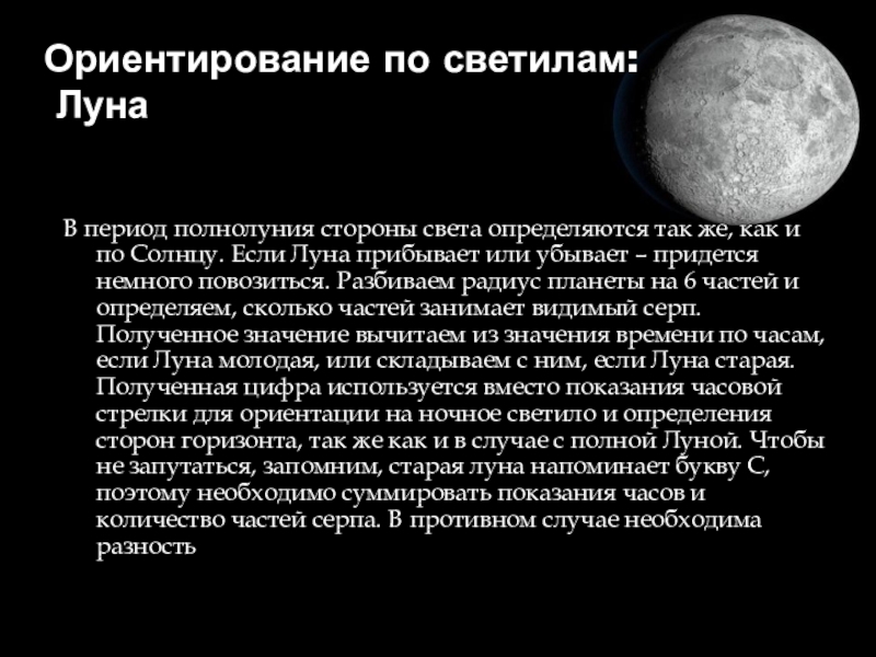 так же, как и по Солнцу. Если Луна прибывает или убывает – придется немного повозиться. Разбиваем радиус планеты на 6 частей и определяем, сколько частей занимает видимый серп. Полученное значение вычитаем из значения времени по часам, если Луна молодая, или складываем с ним, если Луна старая. Полученная цифра используется вместо показания часовой стрелки для ориентации на ночное светило и определения сторон горизонта, так же как и в случае с полной Луной. Чтобы не запутаться, запомним, старая луна напоминает букву С, поэтому необходимо суммировать показания часов и количество частей серпа. В противном случае необходима разность