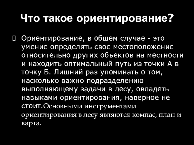 местоположение относительно других объектов на местности и находить оптимальный путь из точки А в точку Б. Лишний раз упоминать о том, насколько важно подразделению выполняющему задачи в лесу, овладеть навыками ориентирования, наверное не стоит.Основными инструментами ориентирования в лесу являются компас, план и карта.