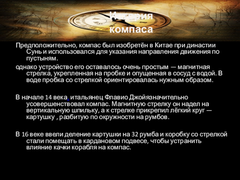 В начале 14 века. итальянец Флавио Джойязначительно усовершенствовал компас. Магнитную стрелку он надел на вертикальную шпильку, а к стрелке прикрепил лёгкий круг — картушку , разбитую по окружности на румбов.