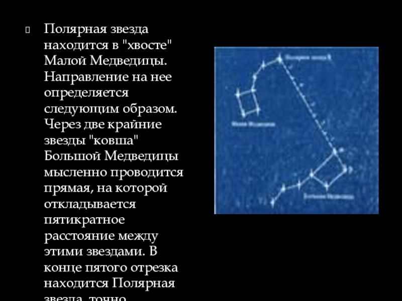 Слайд 14Полярная звезда находится в "хвосте" Малой Медведицы. Направление на нее определяется