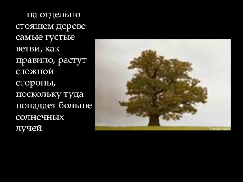 Слайд 21на отдельно стоящем дереве самые густые ветви, как правило, растут с