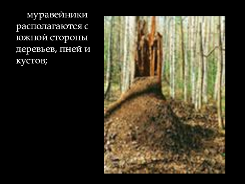 Слайд 17муравейники располагаются с южной стороны деревьев, пней и кустов;
