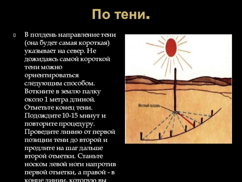 север. Не дожидаясь самой короткой тени можно ориентироваться следующим способом. Воткните в землю палку около 1 метра длиной. Отметьте конец тени. Подождите 10-15 минут и повторите процедуру. Проведите линию от первой позиции тени до второй и продлите на шаг дальше второй отметки. Станьте носком левой ноги напротив первой отметки, а правой - в конце линии, которую вы начертили. Сейчас вы стоите лицом на север.