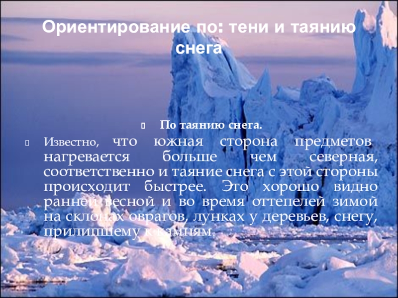 предметов нагревается больше чем северная, соответственно и таяние снега с этой стороны происходит быстрее. Это хорошо видно ранней весной и во время оттепелей зимой на склонах оврагов, лунках у деревьев, снегу, прилипшему к камням.
