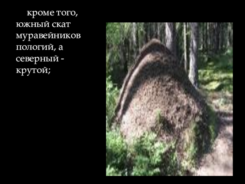 Слайд 18кроме того, южный скат муравейников пологий, а северный - крутой;