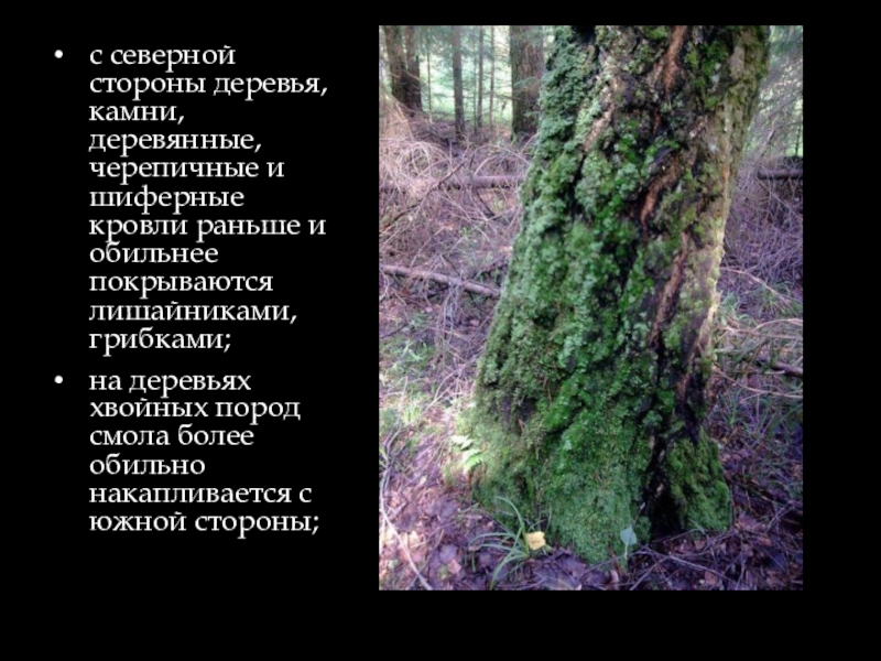 на деревьях хвойных пород смола более обильно накапливается с южной стороны;