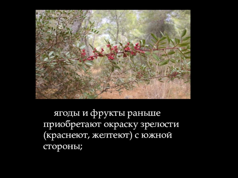 Слайд 20ягоды и фрукты раньше приобретают окраску зрелости (краснеют, желтеют) с южной