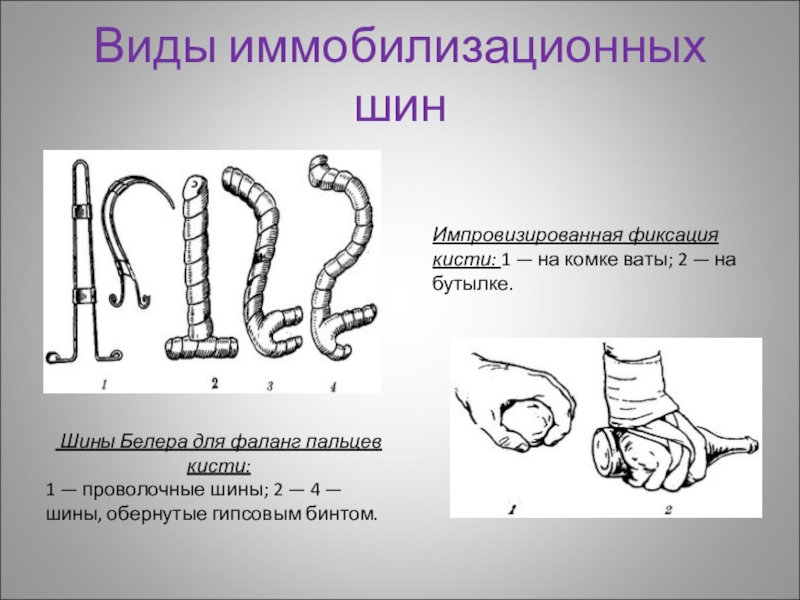 Импровизированная фиксация кисти: 1 — на комке ваты; 2 — на бутылке.