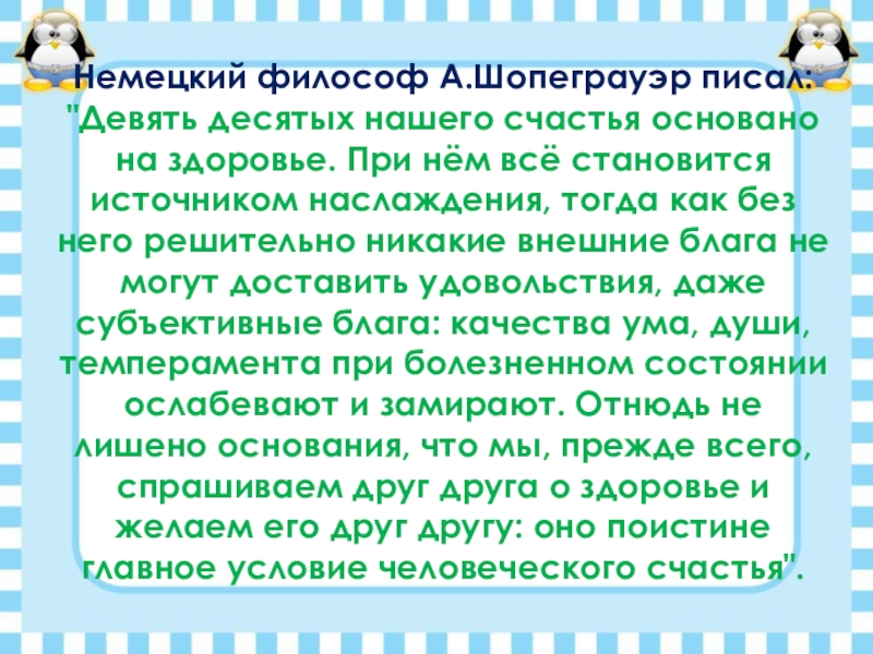 Слайд 25Немецкий философ А.Шопеграуэр писал: "Девять десятых нашего счастья основано на здоровье.