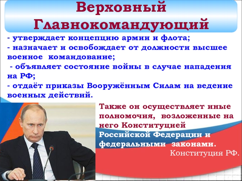 - отдаёт приказы Вооружённым Силам на ведение военных действий.