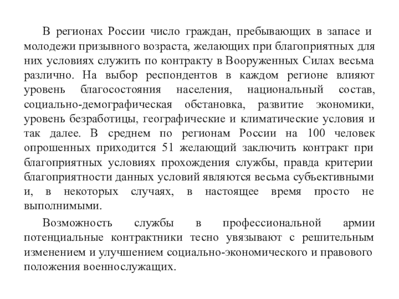 возраста, желающих при благоприятных для них условиях служить по контракту в Вооруженных Силах весьма различно. На выбор респондентов в каждом регионе влияют уровень благосостояния населения, национальный состав, социально-демографическая обстановка, развитие экономики, уровень безработицы, географические и климатические условия и так далее. В среднем по регионам России на 100 человек опрошенных приходится 51 желающий заключить контракт при благоприятных условиях прохождения службы, правда критерии благоприятности данных условий являются весьма субъективными и, в некоторых случаях, в настоящее время просто не выполнимыми.