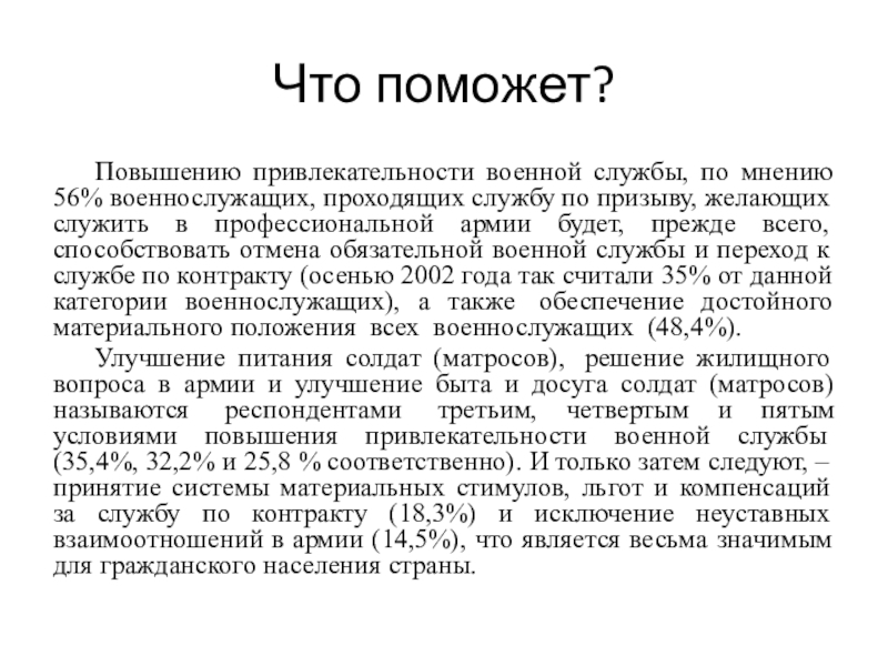 по призыву, желающих служить в профессиональной армии будет, прежде всего, способствовать отмена обязательной военной службы и переход к службе по контракту (осенью 2002 года так считали 35% от данной категории военнослужащих), а также обеспечение достойного материального положения всех военнослужащих (48,4%).