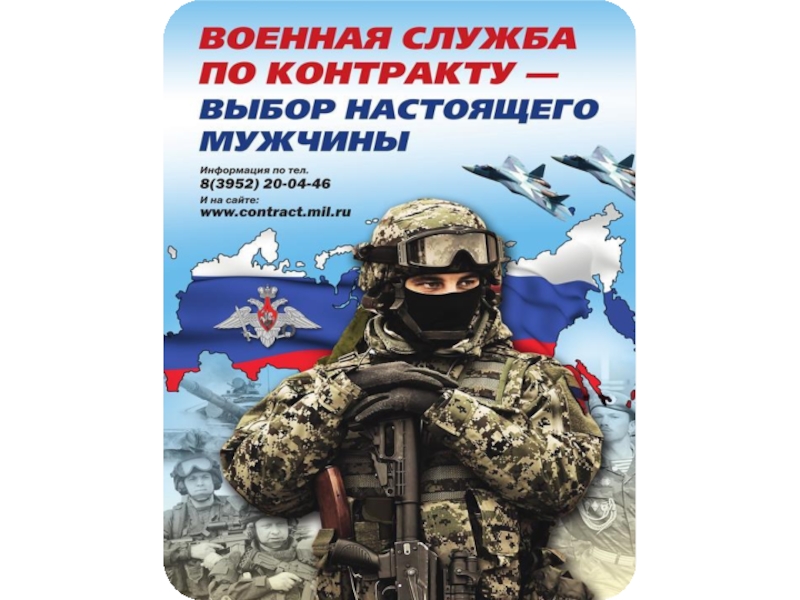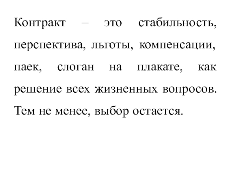 Слайд 19Контракт – это стабильность, перспектива, льготы, компенсации, паек, слоган на плакате,